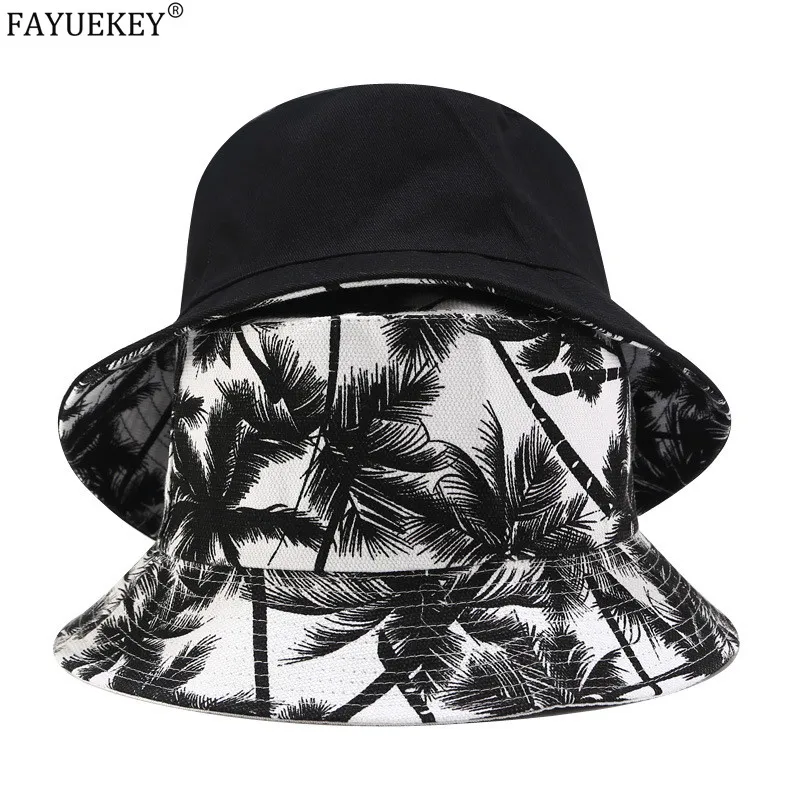 2020 New Fashion Summer Reversible Black White Coconut Tree Printed Fisherman Caps Bucket Hats Unisex Gorro Pescador Men Women