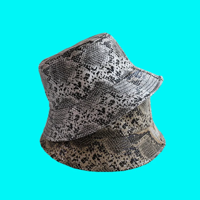 Vintage Snakeskin Print PU Bucket Hat Fisherman Hat Black White Bucket Hat Fashion Panama Fishing Fisherman Hat